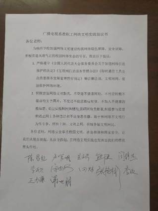 通信工程系在科研楼407会议室线上线下同步开展了“遵守网络文明公约,倡导绿色健康上网”教师学习活动;信息工程系在党员活动室开展了网络法规教育活动;信号处理与传输研究院、量子信息研究所和通信与网络技术国家工程研究中心在科研楼1406会议室开展了网络文明实践活动;广播电视系组织教职工在网络文明倡议书上签名;学院办公室发起了“遵守网络文明公约 倡导绿色健康上网”倡议。