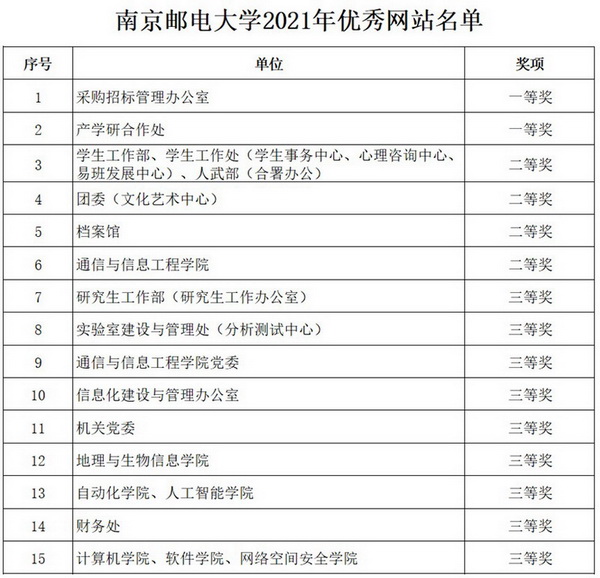在各二级单位对照《南京邮电大学二级网站评价指标体系》对本单位网站进行优化提升的基础上,学校组织校内外评审专家按照评价指标体系的要求,对全校各二级常设机构网站进行了评定打分,综合评选出优秀网站一等奖2个,二等奖4个,三等奖9个。