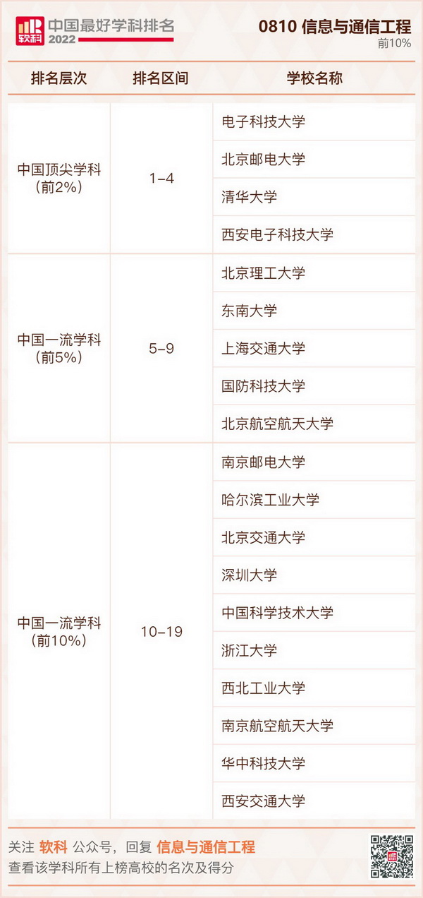 9月21日,上海软科对外发布“2022软科中国最好学科排名”,共有484所高校的5035个学科点上榜。我院信息与通信工程入选中国一流学科,位列全国第10名。