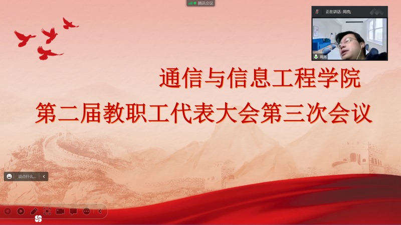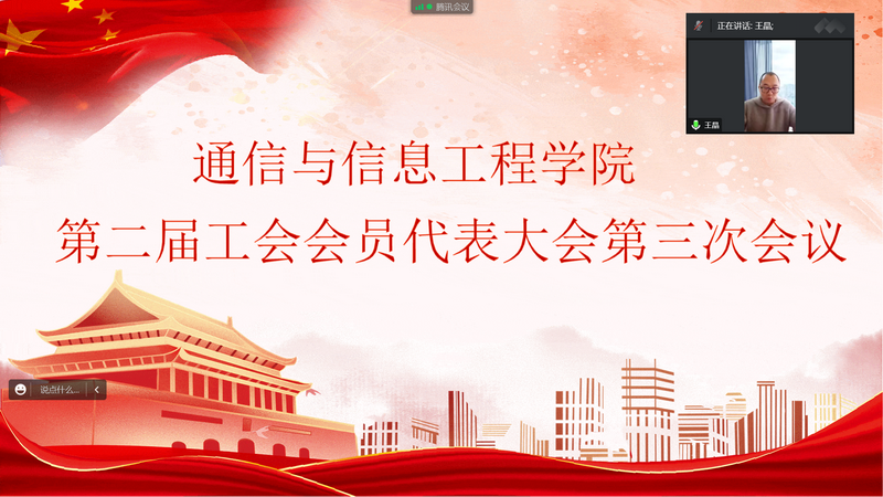 12月28日上午10点,通信与信息工程学院召开第二届教职工代表大会暨第二届工会会员代表大会(以下简称“两代会”)第三次会议,学院“两代会”正式代表参加会议,学院民主党派、无党派人士、统战团体成员代表应邀列席会议。由于受疫情影响,本次会议采用线上方式举行,学院党委副书记兼副院长、分工会主席王晶主持会议。