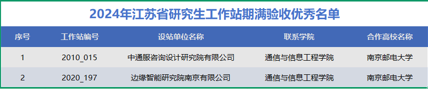 近日,江苏省教育厅和省科技厅联合公布了“2024年江苏省研究生工作站期满验收结果”,学院参与考核的研究生工作站全部顺利通过。其中,中通服咨询设计研究院有限公司、边缘智能研究院南京有限公司2家研究生工作站获评“江苏省优秀研究生工作站”。截至目前,学院已累计获评3个江苏省优秀研究生工作站。