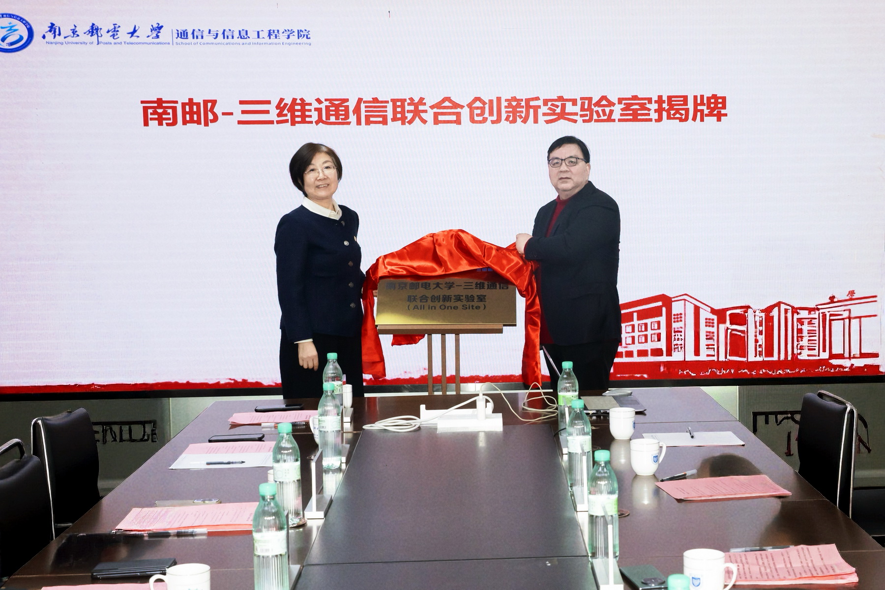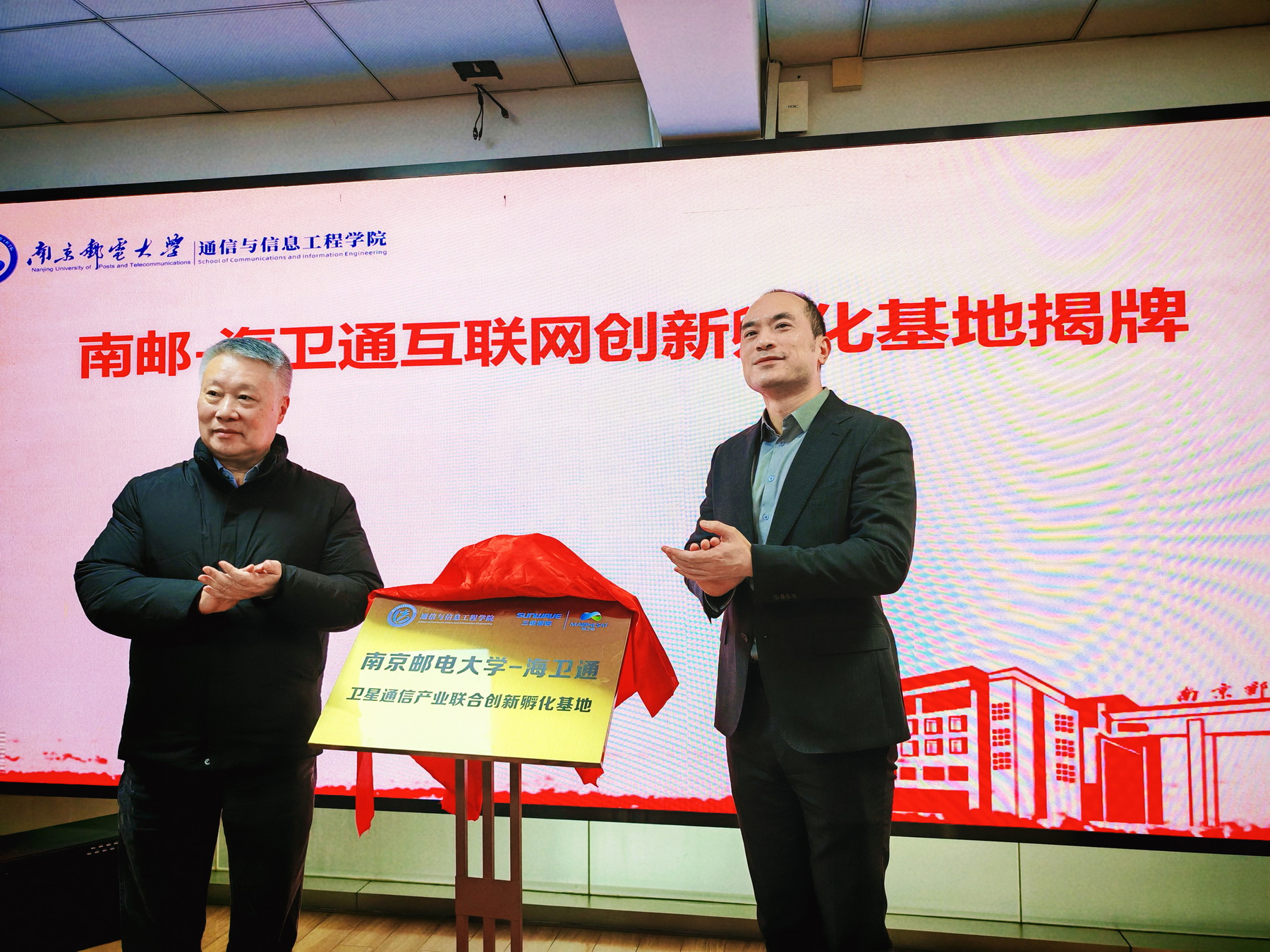李卫义代表三维通信向学校提交捐赠设备清单,刘陈向其颁发捐赠证书。李卫义和姜小舜、张帆和朱洪波共同为“南邮——三维通信联合创新实验室”与“南邮——海卫通互联网创新孵化基地”揭牌。