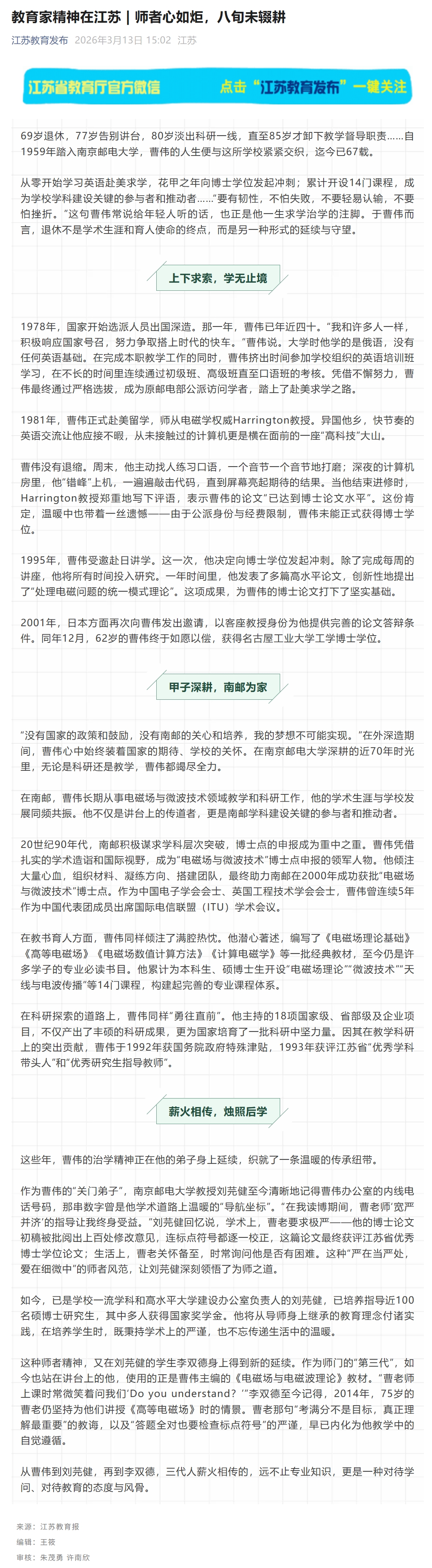 【江苏教育发布】教育家精神在江苏丨师者心如炬,八旬未辍耕