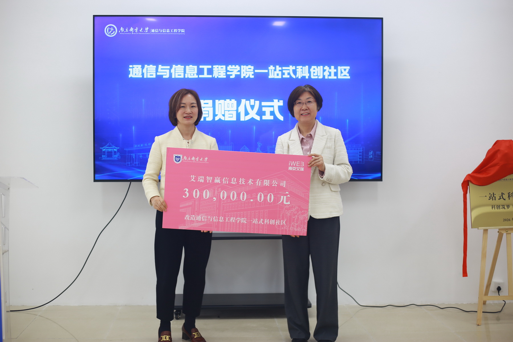 在全体与会嘉宾与师生的共同见证下,学院党委徐雷书记与南京艾瑞智赢信息技术有限公司董事长杨利霞共同为“一站式科创社区”揭牌。活动现场,艾瑞向学院捐赠30万元用于一站式科创社区改造。这一举动,象征着校企双方将深度协同,将产业前沿资源、真实项目与校内教育实践紧密融合。